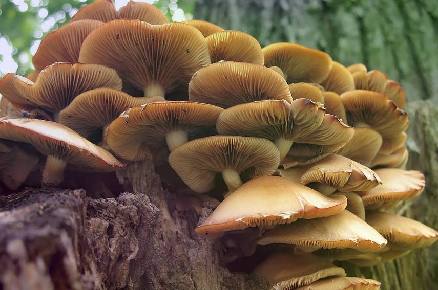Грибница опёнка тёмного образует под корой дерева чёрные мицелиальные тяжи, которые хорошо заметны даже невооружённым взглядом. Споры у данных плодовых тел эллипсовидные, гладкие и бесцветные. Самым значимым является тот момент, что тёмные еловые опята растут только в нижней части отмерших деревьев, иногда встречаются на живых стволах. Пни выбирают преимущественно хвойные породы, чаще всего сосновые. Ознакомьтесь ещё с одним фото еловых грибов опят, которое ярко иллюстрирует их внешний вид: