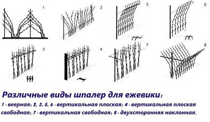 Оптимальная конструкция шпалеры представляет собой три горизонтальных проволоки, натянутых на колья, на высоте 50, 120 и 180 см. Побеги куста размещают на ней одним из следующих способов: