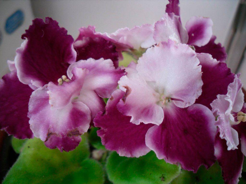 - Фламенко. Сорт характеризуется полумахровыми сиренево-малиновыми цветами с зеленовато-золотистой бахромой и ярко-жёлтым центром. Наличие зелёной «рюши» на цветке является отличительным признаком этих фиалок.
