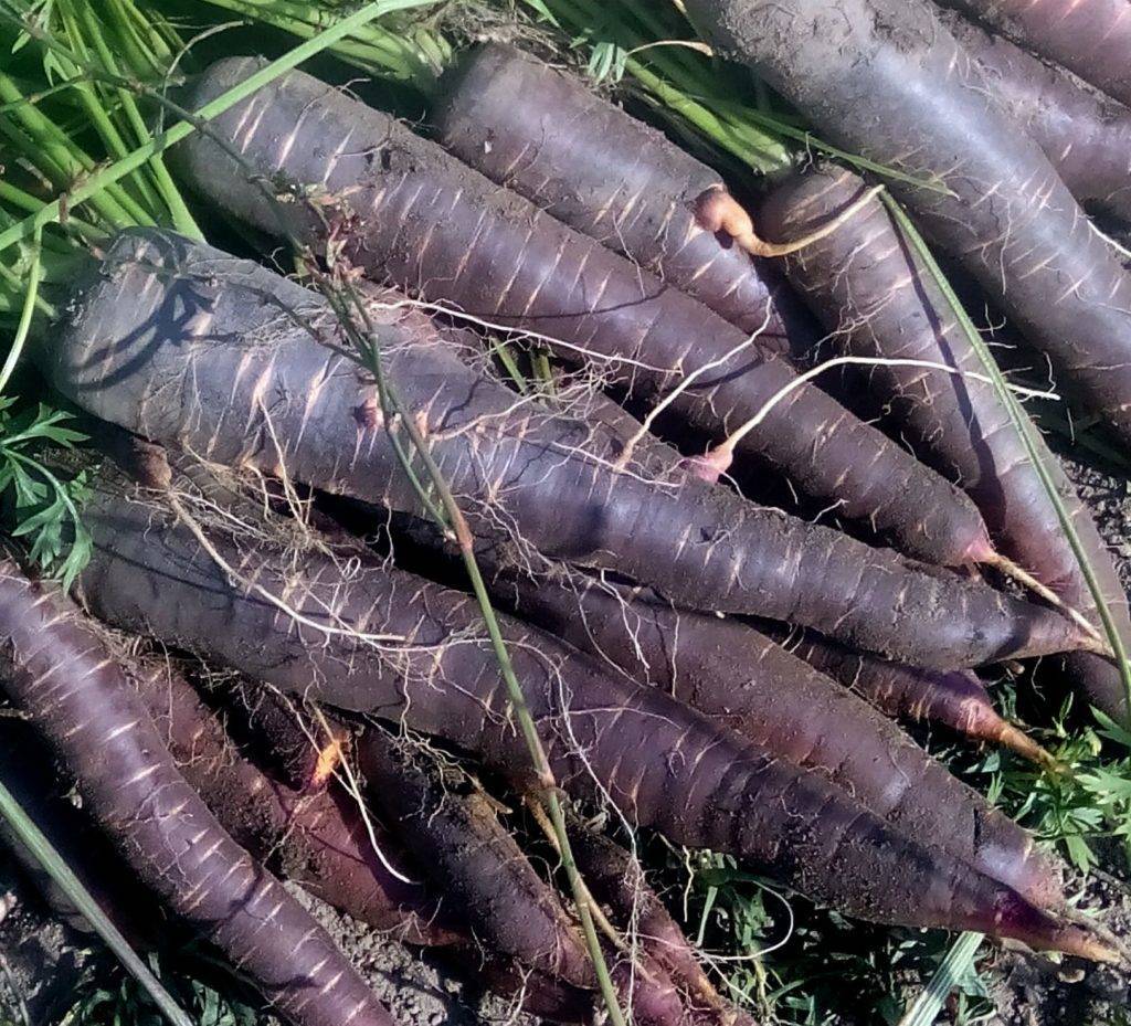 - Фиолетовая морковь позднего срока созревания собирается осенью, в первые две недели сентября в сухую погоду.
