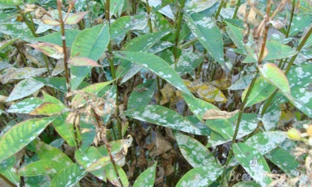 Мучнистая роса проявляется в качестве характерного мучнистого налета на побегах и листьях. С течением времени налет становится черного цвета, а листья увядают. Проявляется болезнь чаще в осенний период, а бороться с ней можно так: