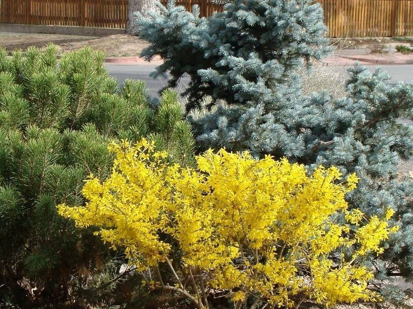 Форзицию можно использовать как одиночное (солитерное) растение в группах с хвойными и для живых изгородей. Если ваша живая изгородь формированная, то есть вы регулярно ее подстригаете и цветение форзиции для вас не главное, то обрезайте форзицию по правилам стрижки и обрезки живой изгороди.