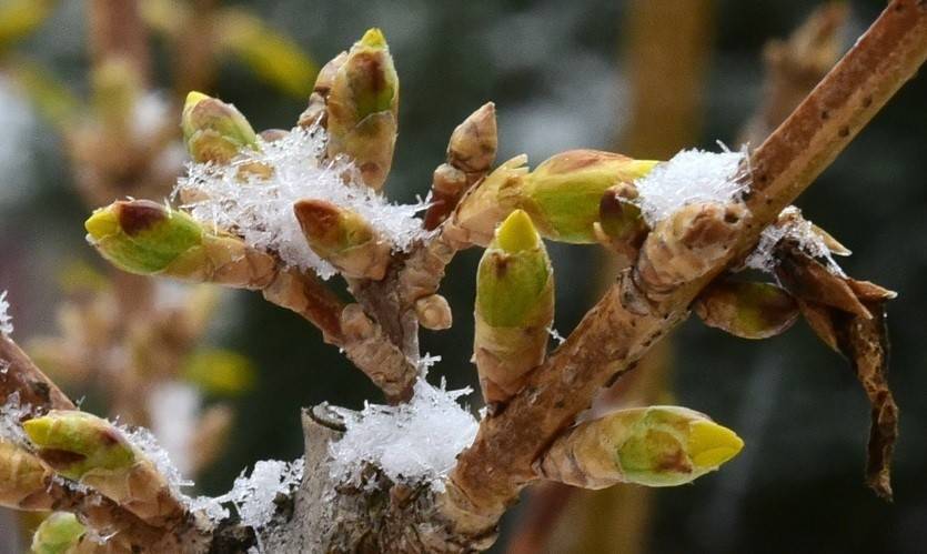 Важно! Зимой, если птицам недостаточно корма, они могут склевывать почки, тем самым причиняя вред форзиции