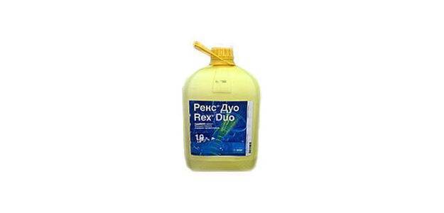 Выпускается Рекс Дуо в форме вязкого раствора желтовато-коричневого оттенка, который расфасован в канистры разного объема.