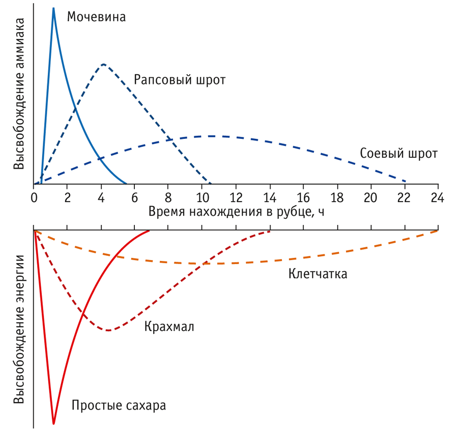Помимо наличия источников азота для синтеза микробного белка необходимо наличие энергии, причем скорость высвобождения из кормов аммиака и энергии должна быть синхронизирована (рис. 2).