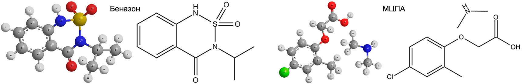 Гербицид имеет действующее вещество – бентазон, механизм действия которого изначально основан на необратимом процессе блокирования фотосинтетического транспорта электронов. В следствии этой реакции прерывается ассимиляция СО 2 и растение после короткой остановки в росте погибает.