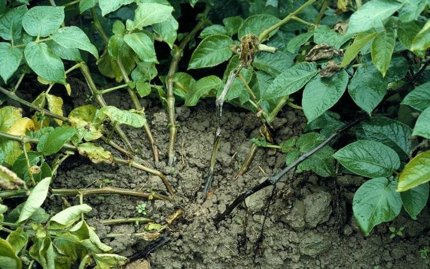 Развитие заболевания происходит при дождливой прохладной погоде. Признаки болезни проявляются практически сразу же после прорастания клубней. Листья приобретают жёлтый цвет, скручиваются, происходит почернение и загнивание стеблей «от корня». Вскоре бактерии поражают клубни, они начинают гнить.