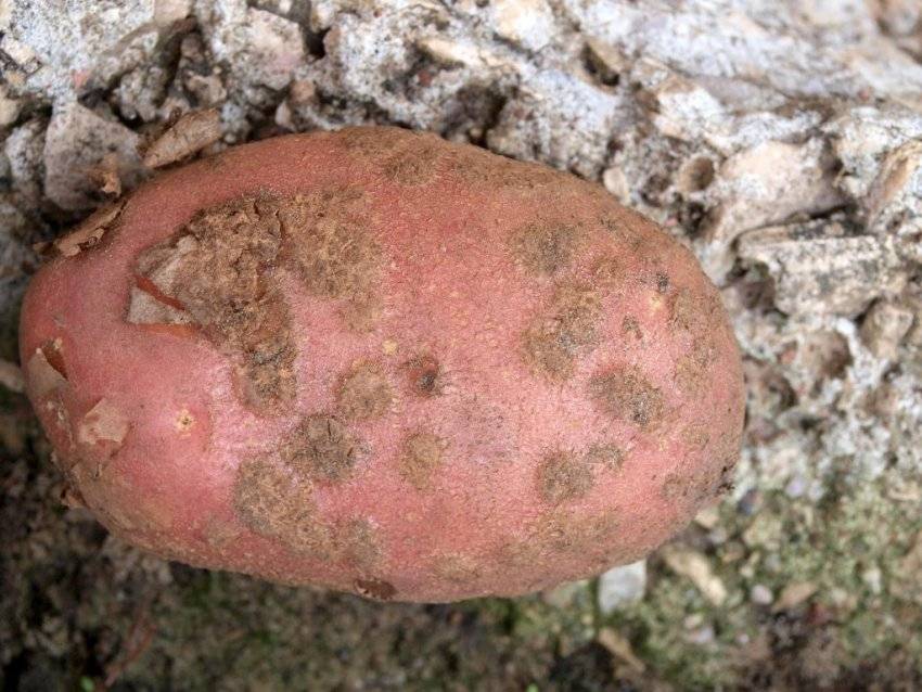 На пораженном клубне появляются небольшие пятна, визуально похожие на кусочки приставшей грязи.