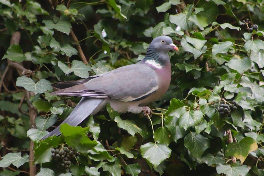 Вяхирь – с виду крупный голубь. Он обладает характерным для этих птиц цветом оперения. Основная часть пера окрашена в сизый цвет, то есть соровато-голубой. Такой окрас позволяет успешно скрываться от недоброжелателей. Крылья витютня украшают широкие белесые шевроны, особенно хорошо их можно разглядеть в полете. Темную вершину хвоста дополняет белый кант. Единственное, что отличает эту птицу от городских собратьев, отсутствие темных поперечных полос на крыле. Грудь вяхиря окрашена в нежный винно-розовый оттенок с зеленым отблеском, который особенно привлекательно смотрится на солнце.