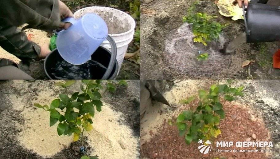 После выравнивают приствольный круг для простоты поливов и обильно поливают. На следующий день приствольный круг мульчируют.