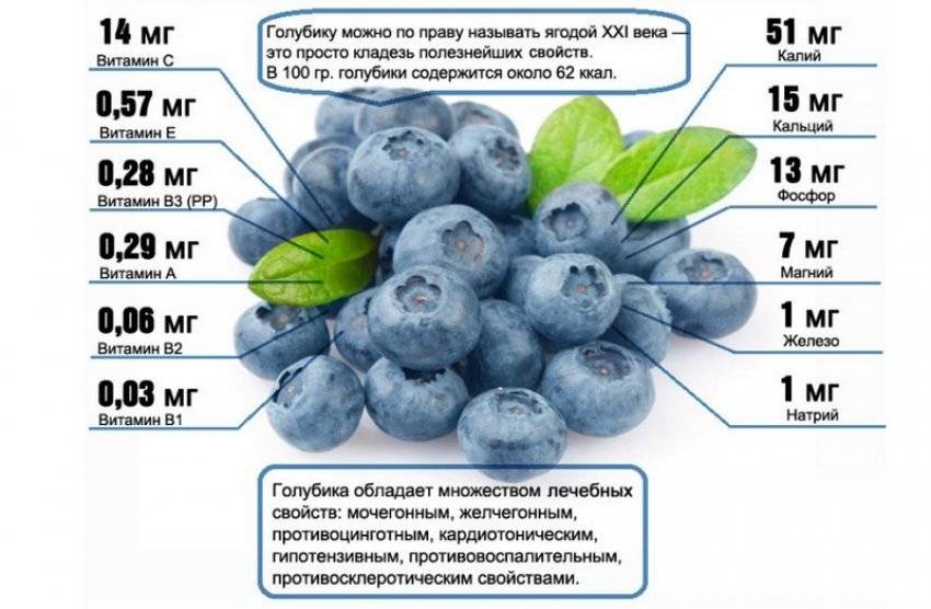 Также в ягодах голубики содержится высокая концентрация витаминов А, С, В1 и В2.