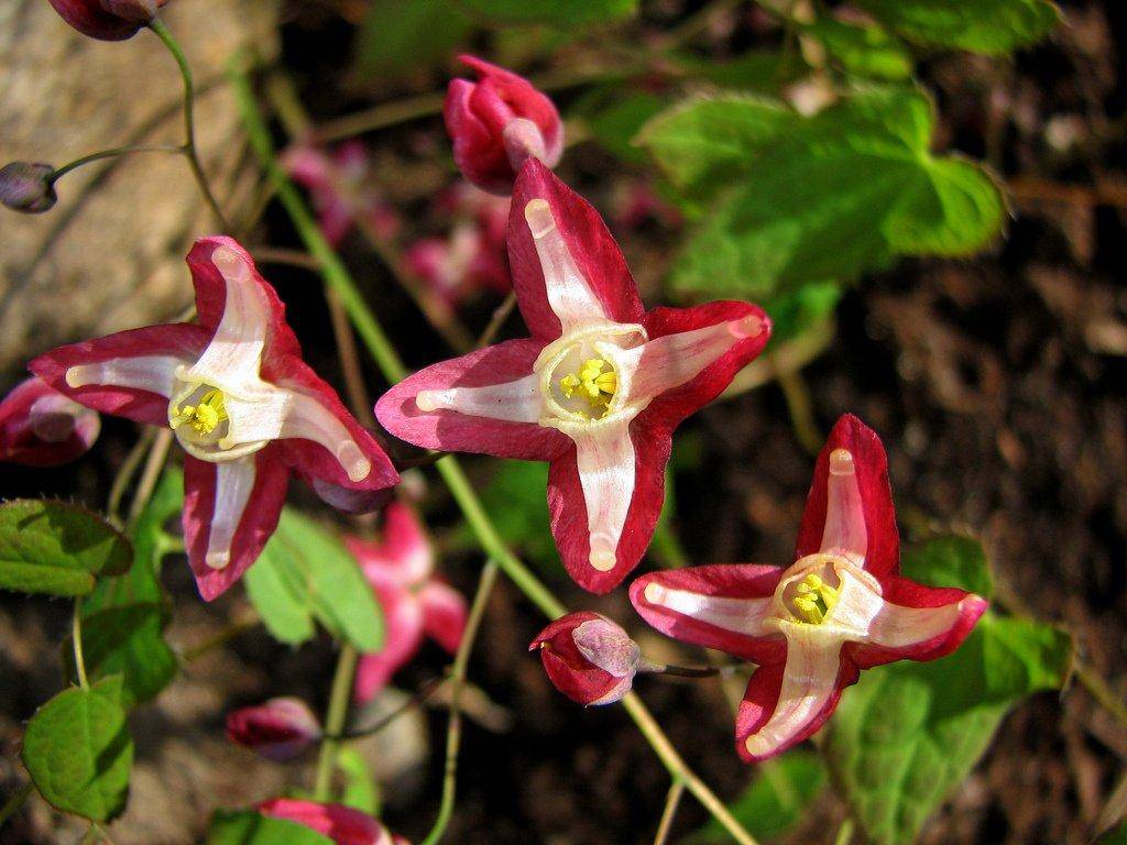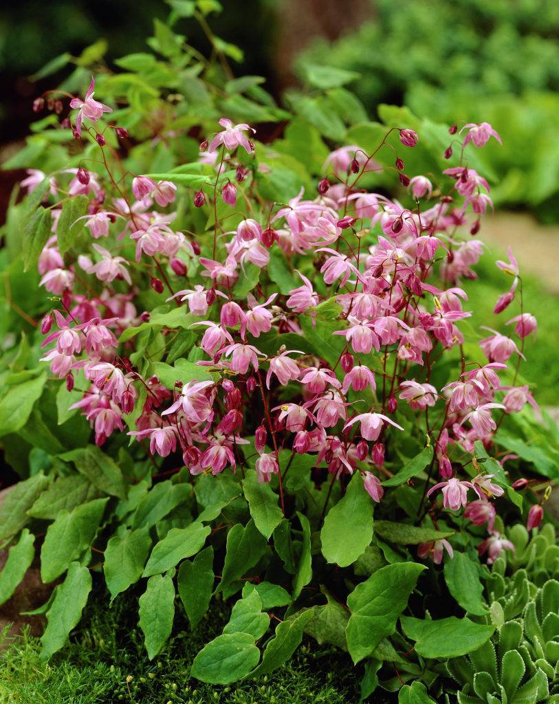 - такой же низкорослый, но медленнорастущий эпимедиум пышный с перистыми, бронзоватыми и постепенно зеленеющими листьями, свисающими белыми или лиловыми цветками, которые распускаются в самом начале весны (нуждается в светлом месте или полутени);