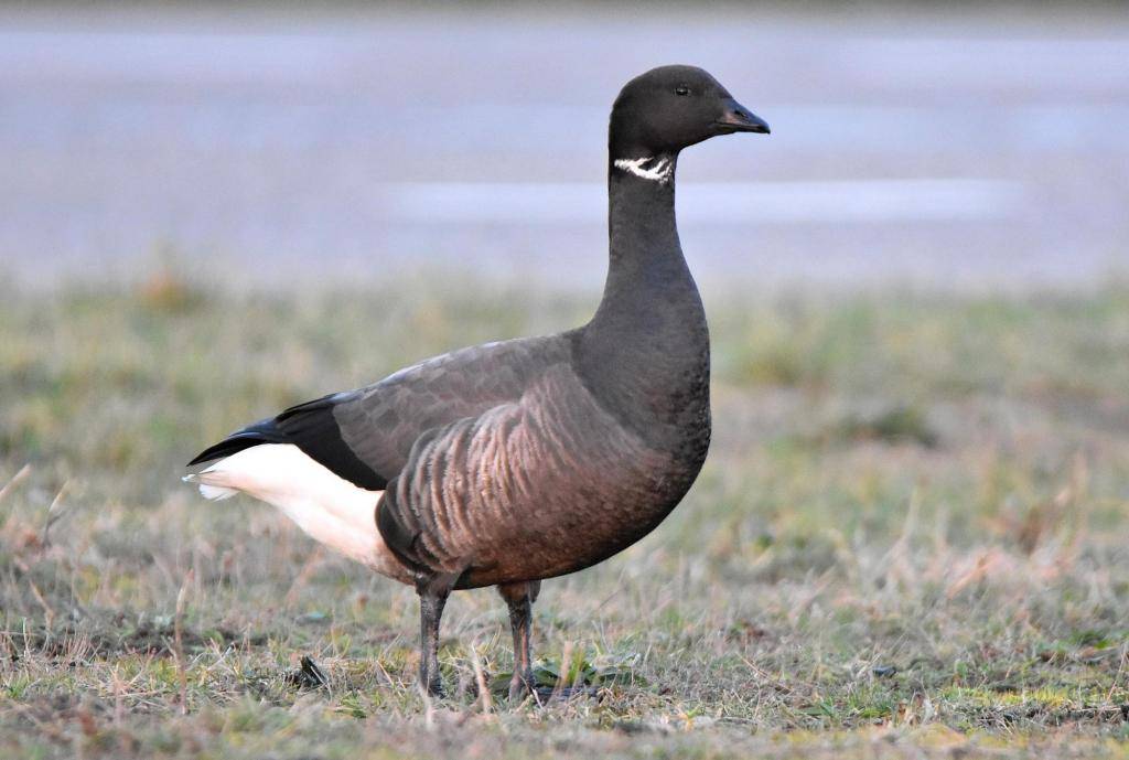 Черная казарка обитает на островах Арктики, арктическом побережье Евразии и Северной Америки. Зимует чаще всего в европейских странах, таких как Франция и Германия, и на Британских островах. Это мелкая птица. Вес ее – 1,2-1,8 кг, длина тела – 0,50 0,69 м. Окрас очень интересный. У взрослой особи черная голова, а также шея и грудь. Но белое подхвостье. И на шее можно увидеть узкий белый ошейник.