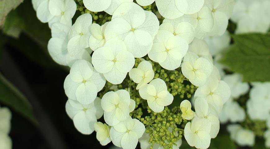- О цветах. Соцветия напоминают метелки со стерильными крупными цветами. Цветет кустарник с июня по сентябрь белым цветом. Растет быстро, сохраняет длительное время цветоносы.