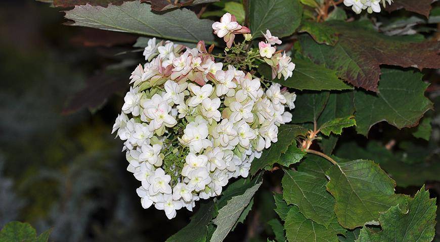 - О сорте. Декоративный кустарник способный украсить любой сад. Родина растения — Северная Америка. Одинаково красивая гортензия, как в период цветения, так и период роста. В высоту достигает 2 м, основной характеристикой являются 7-лопастные листья похожие на дубовые.