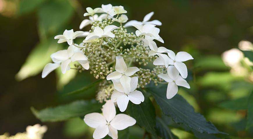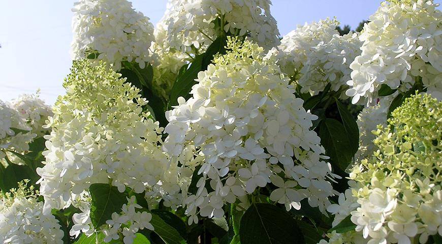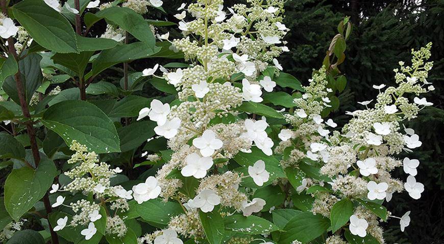 Классическая гортензия с небольшими (20 см) рыхлыми белыми соцветиями. Куст высотой 1,5–1,8 м.