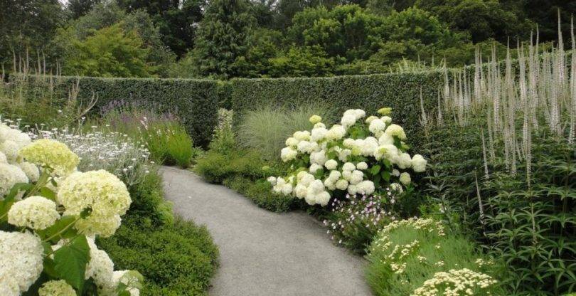 Для белого сада используются кустарники древовидного и крупнолистного вида с цветами белоснежного или бело-лимонного окраса. Метельчатые гортензии следует выбирать с неизменными в процессе цветения соцветиями. Метельчатые бело цветковые празднично выглядят с белыми розами.