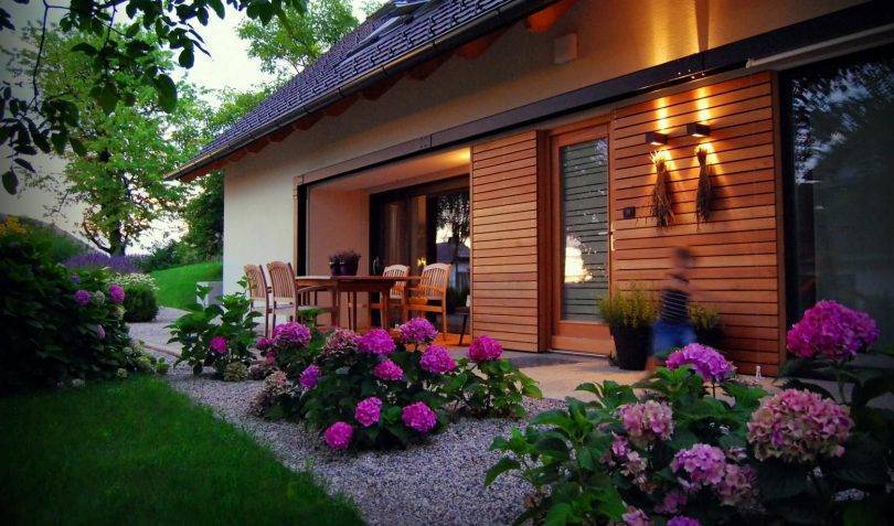 Гортензия возле дома передает все буйство красок, и подчеркивает архитектурный стиль строения