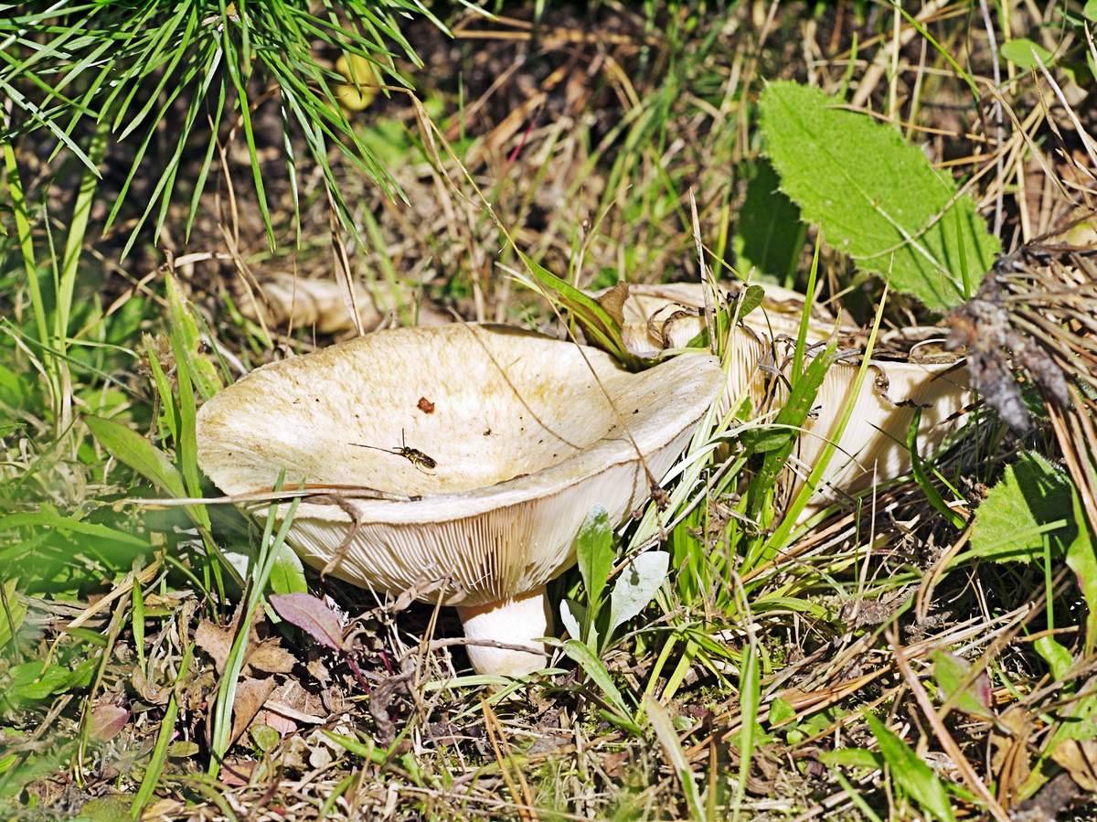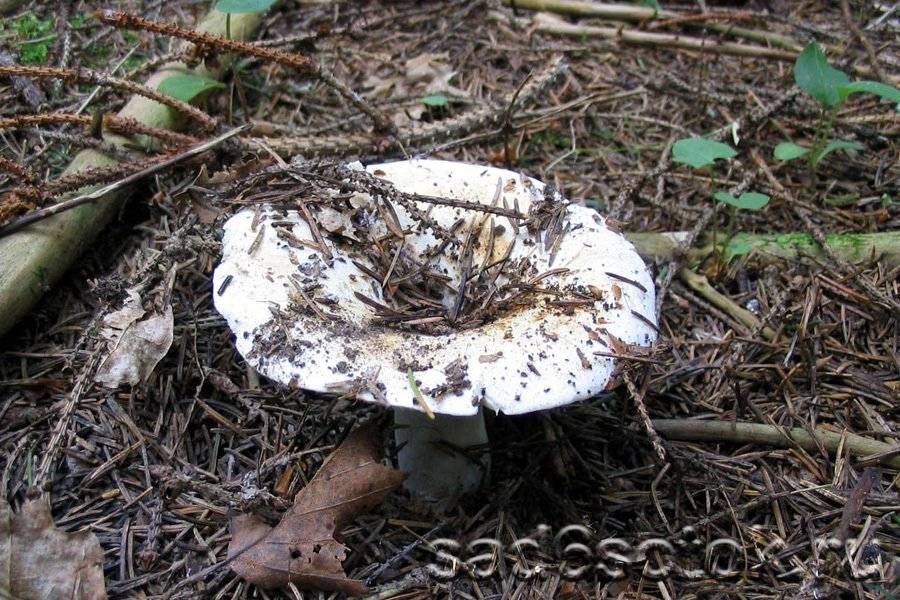 Подгруздок белый – вкусный и ароматный вид сыроежек, шляпка беловато-кремовая с бурыми разводами, диаметром до 20 см, округло-выпуклая, а затем вогнутая. Пластинки частые, кремово-белые, ниспадают на ровную или слегка изогнутую крепкую ножку. Мякоть тугая, кремовая, с тонким грибным ароматом и едким вкусом.