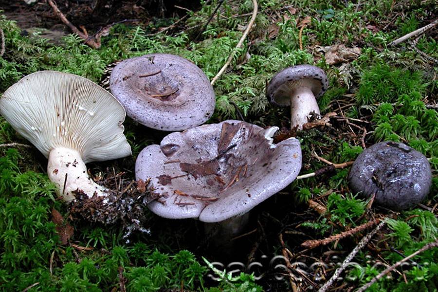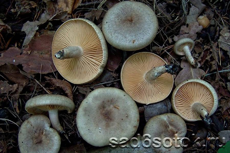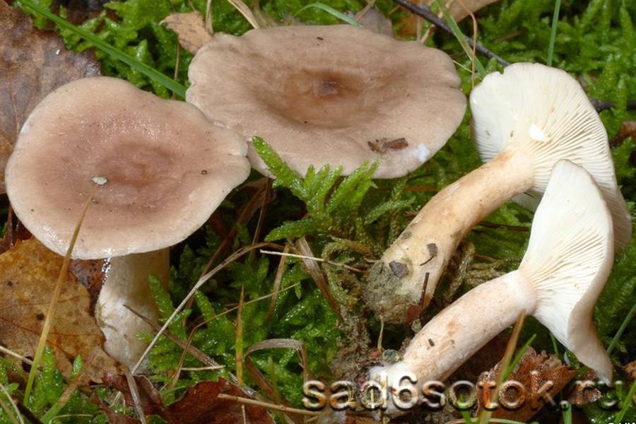 Млечник блёклый – шляпка меняется от сиреневой до белой или серой с небольшой выпуклостью с немного вдавленным центром, более тёмным, чем края. Ножка ровная и чуть-чуть изогнутая, гораздо светлее шляпки.
