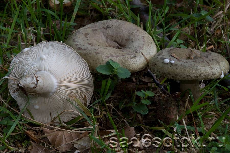 Млечник липкий – имеет серо-зелёную шляпку с тёмными пятнами. Центр темнее, чем края. Ножка на ощупь клейкая, посветлее шляпки. Мякоть белого цвета, практически без запаха, на вкус жгуче-перечная. Млечный сок липкий, на изломе становится зелёным или оливковым.