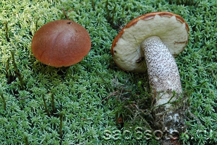 Этот гриб распознать намного проще. Его шляпка имеет насыщенно красный цвет и наиболее заметна среди листвы даже издалека. Мякоть мясистая и очень плотная. Ножки имеют белый цвет с небольшими чешуйками. Грибникам не стоит пугаться необычных изменений при сборе данного вида. Когда гриб срезают, то поврежденное место приобретает синий оттенок, а затем чернеет.
