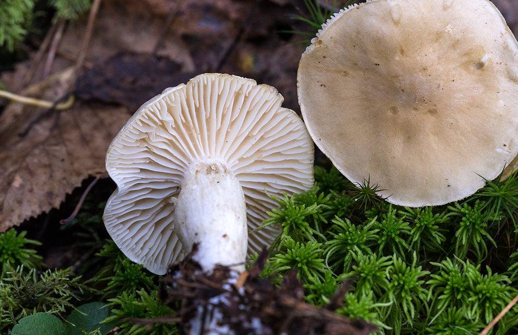 - Майская трихолома – очень похожа по цвету и форме на своего ядовитого собрата, но абсолютно безопасна для жизни человека и имеет приятный вкус и запах, похожий на аромат свежей муки. От белой рядовки она отличается цветом – молочно-белым, даже кремовым, узкими пластинками, приросшими к ножке.