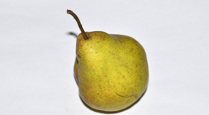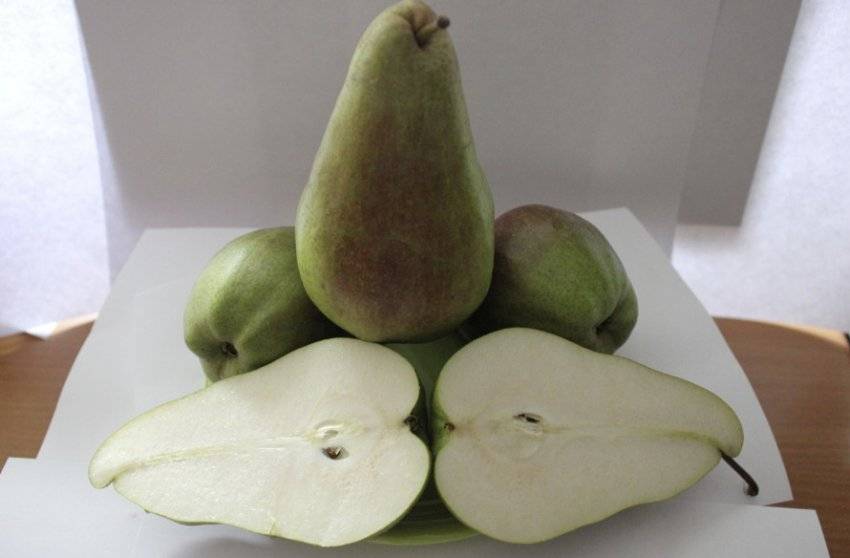 Первый урожай с этого грушевого дерева получают на 5 сезон после высадки саженцев на постоянное место. Спелые плоды имеют правильную грушевидную форму, их масса обычно колеблется в пределах 200-215 г. Окраска кожицы – желтая с золотистым отливом, а покровная обычно бывает красновато-коричневой. Подкожные точки – немногочисленные, небольшого размера, сероватой окраски. Сочная мякоть имеет кремовый оттенок, ее плотность немного выше средней, маслянистая.