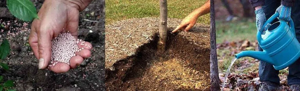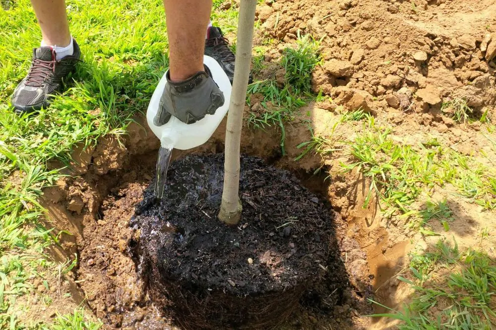 Яму засыпают землёй, немного утрамбовывают и обильно поливают. Землю в приствольном круге рекомендуется мульчировать — это сократит испарение влаги и замедлит появление сорняков, а то и вовсе сведёт его не нет.