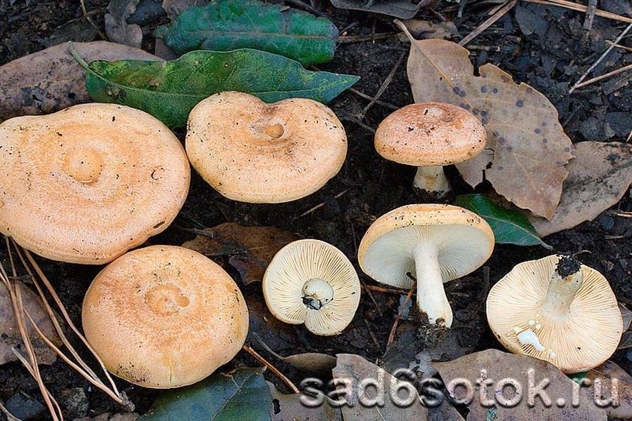 - Груздь желтый – на третьем месте по распространенности. Эту разновидность причисляют к категории съедобных, и отличается она желтоватым окрасом шляпки и ножки. Груздь желтый может быть крупнее других – шляпка до 25 см в диаметре, а ножка не больше 12 см. Мякоть гриба источает горьковатый млечный сок. Отличие этой разновидности заключается в том, что поверхность ножки с желтоватыми выемками. Пластинки очень тонкие, желтоватого оттенка, у старых грибов могут становиться бурыми.