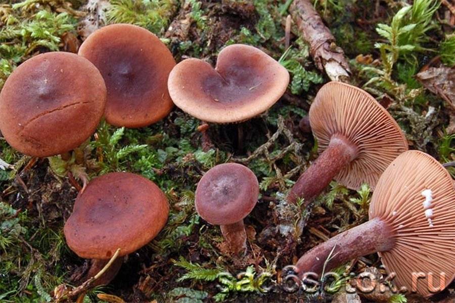 - Груздь болотный – это разновидность, которая относится к категории съедобных грибов. По питательной ценности опережает другие виды. Шляпка болотного груздя хрупкая, округлая и у старых грибов приобретает форму воронки, а у молодых – распростертая. Окрас шляпки – красно-коричневый, или же кирпичный, редко – охристый при выцветании. Пластинки нисходящие. Ножка длинная, до 15 см и до 2,5-3 в диаметре, расширяющаяся к низу и покрытая пухом. Мякоть этого гриба окрашена в сливочный оттенок, в срезе выделяет сок. Млечный сок быстро окисляется придавая мякоти серо-желтый оттенок.