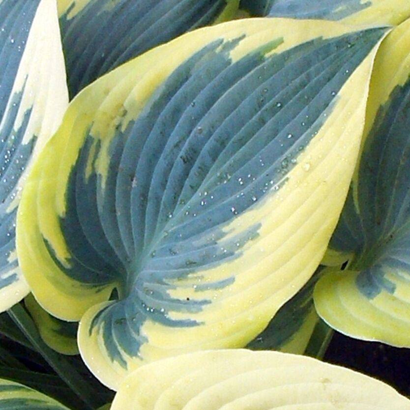 Длина листа — 15-18 см, ширина — 12-13 см. Листовая пластина голубоватого цвета, по краям — золотисто-желтая (к осени основной фон становится темно-зеленым, а штриховатая кайма – кремовой).