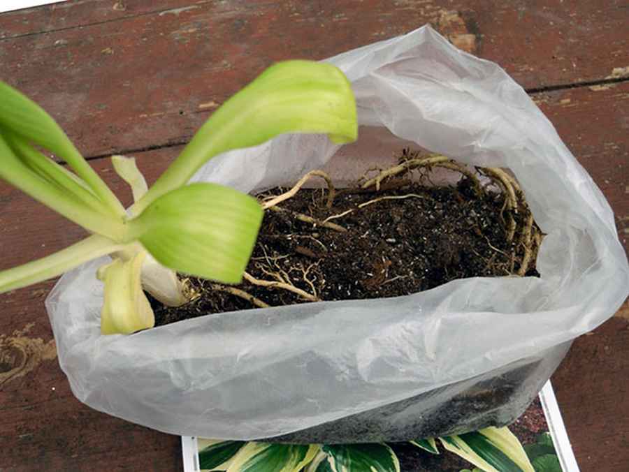 Полученные деленки сразу высаживают на постоянное место. Черенкование хосты можно проводить в течение всего лета. Для этого от растения отделяют молодые побеги с пяточкой, обрезают листья на треть, высаживают в тенистом месте, накрыв пластиковой бутылкой. В первые дни листья будут лежать на земле — тургор потерян, но уже спустя пару недель черенки укоренятся.