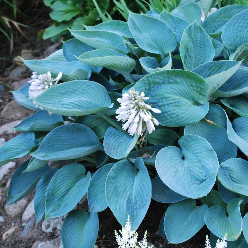 Канадиан Блю. Сорт голубых хост с ровными сердцевидными листьями сизо-голубого оттенка с восковым налетом на поверхности. Кусты высотой 40-50 см разрастаются до 90 см в ширину.