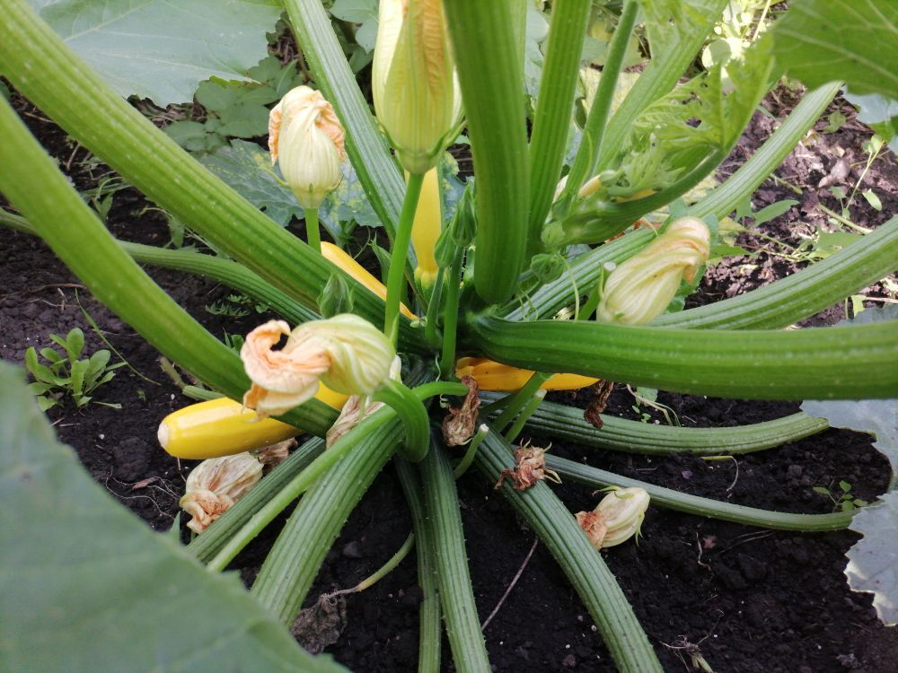 Первые кабачки появляются еще под укрытием. А потом снимаю пленку, а когда минует угроза возвратных заморозков — снимаю и дуги с нетканым материалом.