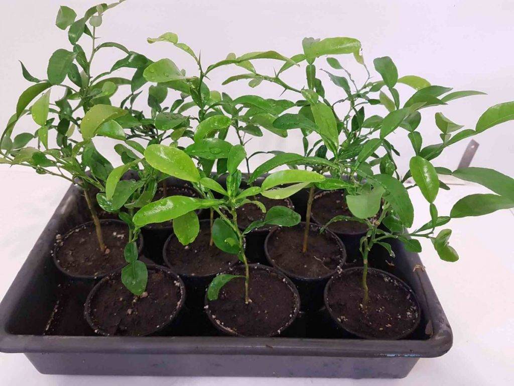 Уже укорененные, окрепшие саженцы Кафрсокго лайма, выращенные из косточки.