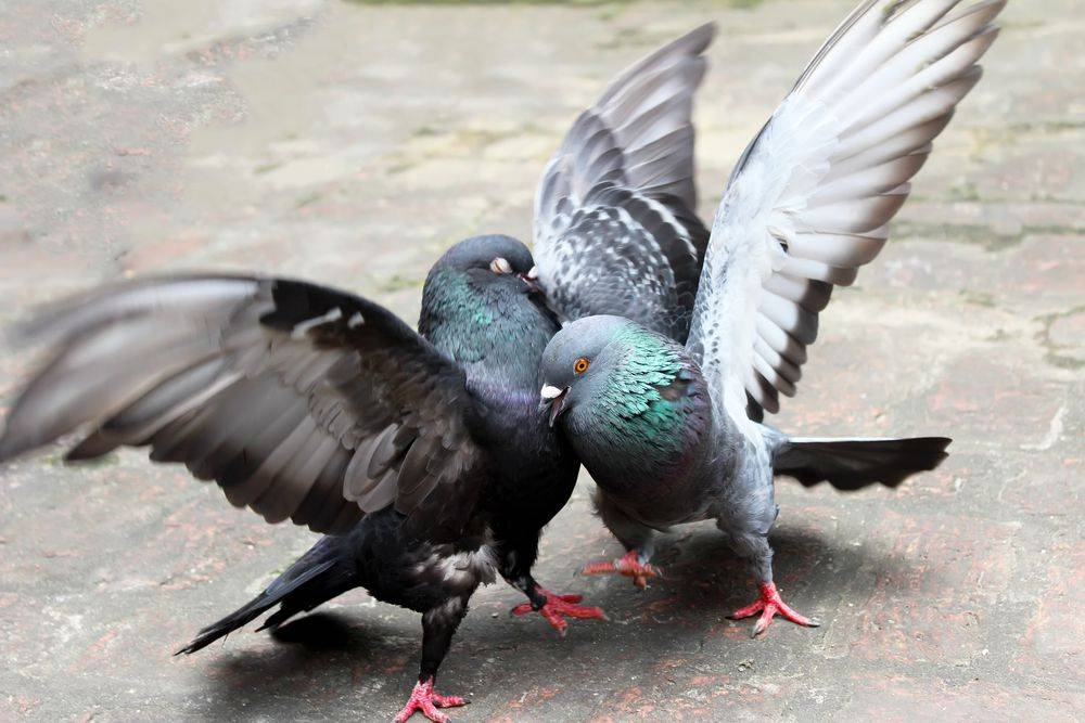 Если в клетку посадить двух представителей мужского пола, которые активны и агрессивны, то начнется конфликт. Это происходит из-за борьбы за жизненное пространство, стремления выяснить, кто из них сильнее. В этом отличие от двух самочек, которые сосуществуют мирно и даже воркуют. Разнополые экземпляры начинают парование: голубь голубку обнимает, активно ухаживает за ней.