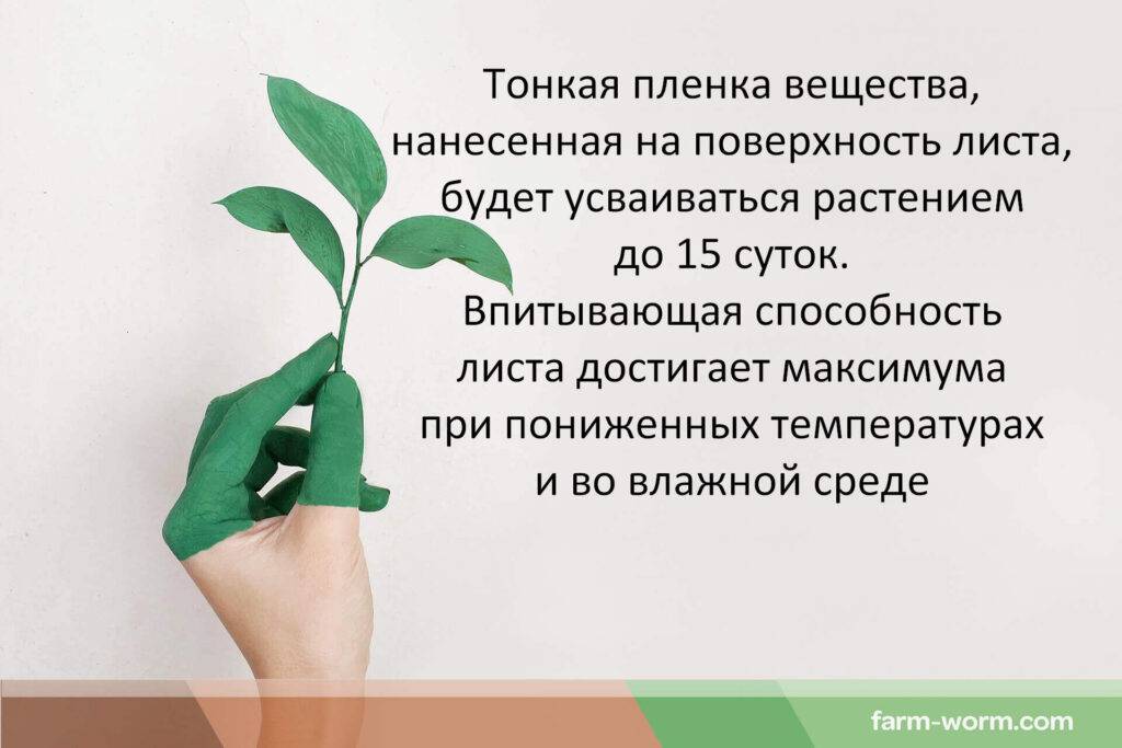 | 2 | Через листья быстрее усваиваются растворенные в воде микроэлементы – азот, железо, медь и так далее | При неправильном хранении раствор быстро теряет свойства |