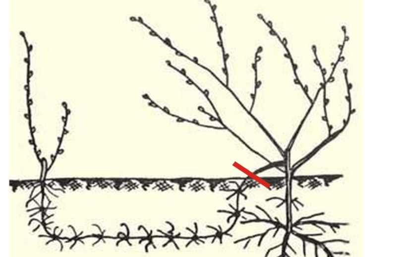 После осенней высадки тот участок отводка, который находится в грунте, весной пустит корни. Из каждого глазка сформируется по 1-2 побега. В сентябре или в октябре отводок можно перерезать. На картинке ниже место среза отмечено красной линией.