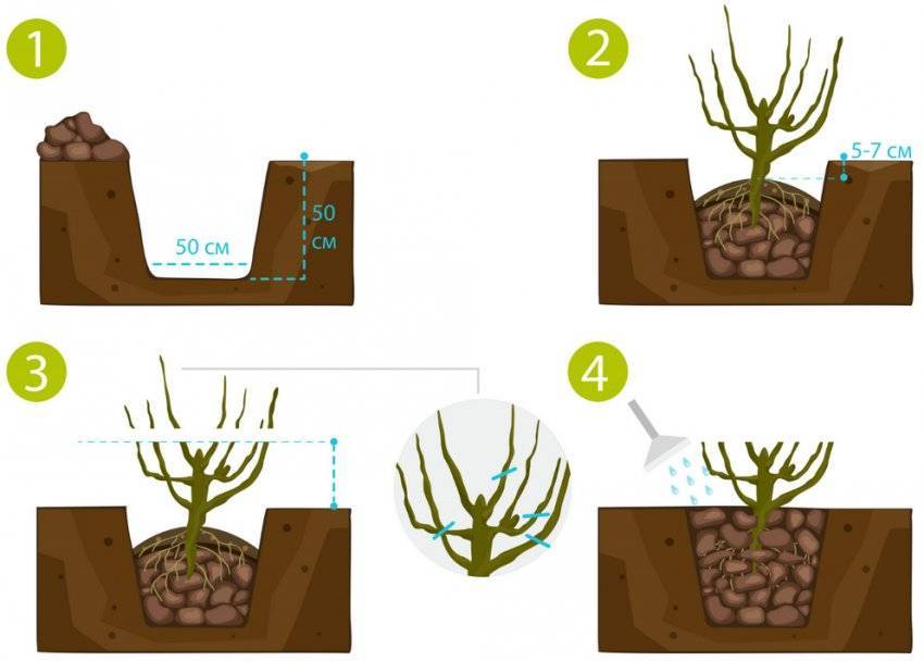 Надземную часть саженца образуют 2-3 ветки высотой 30-40 см. Перед посадкой ветки укорачивают – оставляют не выше 15-20 см. Желательно, чтобы на каждой было не менее 4-5 почек.