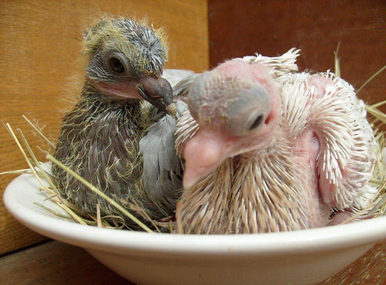 Голубиные «дети» появляются на свет беспомощными. Птенцы рождаются незрячими и без перьев. Вылупившиеся из яйца малыши не приспособлены к самостоятельному существованию. Поэтому в первые недели после появления на свет жизнедеятельность птенцов обеспечивают самка и самец.