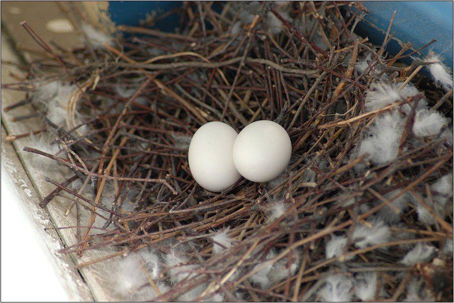 Голубка сносит два небольших яйца, белого цвета или с легким голубым отливом