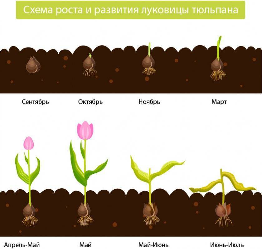 У тюльпана, в отличие от нарцисса, каждый год материнская луковица, отмирая, сменяется замещающей луковицей — деткой. Она достигает габаритов материнской или может быть даже больше.