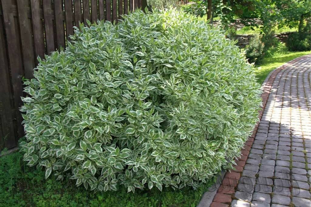 Дерен белый Элегантиссима (Elegantissima). Внешний вид листовой пластины имеет светлую окантовку, цветы окрашены в белый цвет. Высота взрослого растения – 2,5-3 м. Форма кустарника раскидистая, быстро разрастается во все стороны. Листва густая, белого или насыщенного зеленого цвета. Дерен белый элегантиссима в ландшафтном дизайне самый популярный сорт.