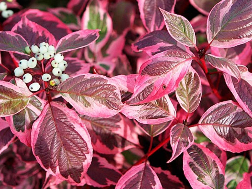 Дерен пестролистный. Куст или дерево достигает высоты 3 м, имеет большое количество прямых ветвей Отличительные особенности растения – кораллово-красные ветви с яркой окраской листвы. Листья с белой или желтой каймой по краю достигают большого размера. Соцветие белое, достигает в диаметре до 6 см. Подходит для создания живого забора или оформления аллеи и сада.