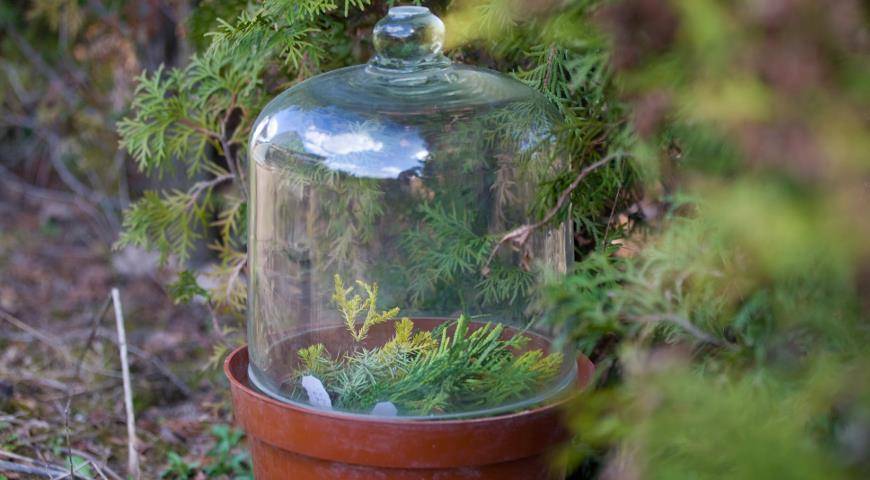 Контейнер с черенками накрывается сверху пленочным материалом, пластиковой или стеклянной емкостью. Место для размещения должно быть выбрано достаточно влажное, при этом необходимо избегать прямого попадания солнечных лучей, которые на данном этапе могут быть губительными