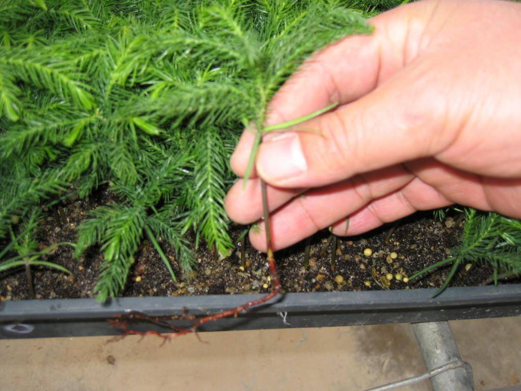 Осенью после успешного укоренения следует произвести рассадку в вазоны большего размера или в открытый грунт на специальную грядку (если погода позволяет). Если вы хотите рассадить в вазоны, то следует приготовить питательный субстрат: просто смешайте огородную почву с верховым торфом. После этого обязательно регулярно поливайте, подкармливайте, устраняйте сорную траву около хвойного растения.