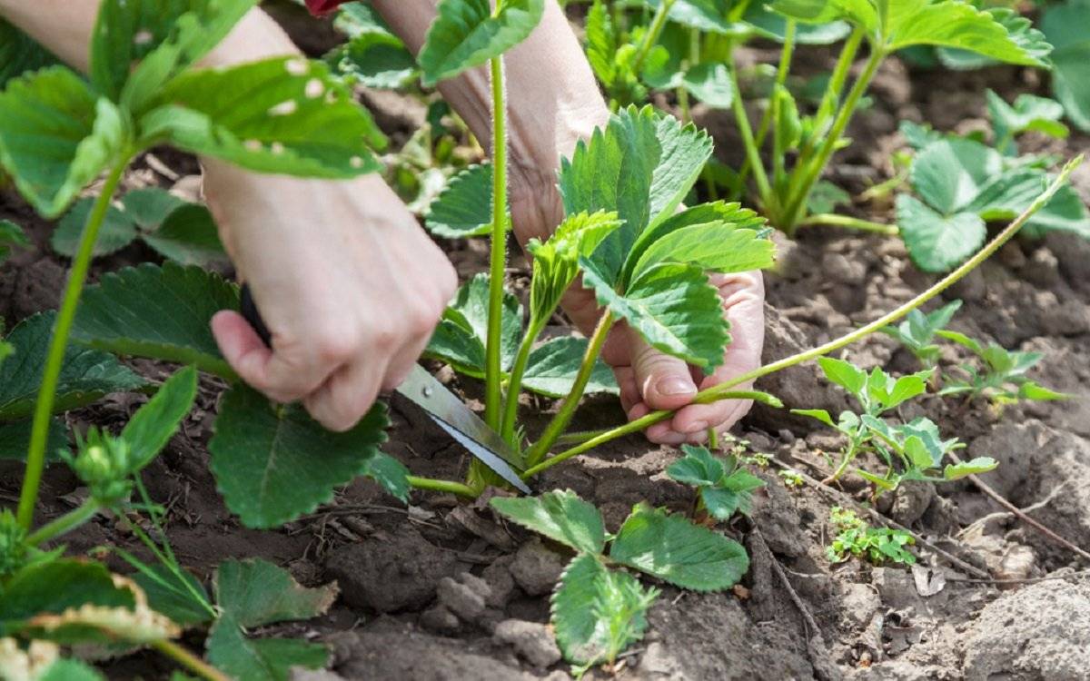 Используйте для обрезки острый секатор или ножницы, но не старайтесь срезать лист «под корень» – на грядке должны оставаться кусты со стеблями и черенками до 10 см длиной. Обрезать нужно только листовые пластины и лишние усы. Молодые развивающиеся розетки прикопайте, чтобы они дали корни. Если же вы не заинтересованы в таком виде размножения, обрезайте и розетки, чтобы они не загущали грядку.