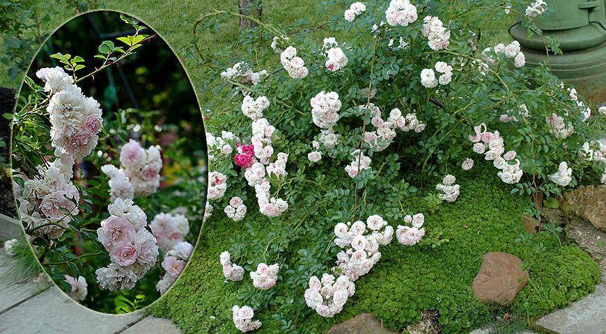 Личный опыт: Из мелкоцветковой розы можно получить практически что угодно: можно поднять наверх, и получится классическая плетистая роза на опоре, а можно оставить внизу и сделать из нее почвопокровную. Моя роза в своей жизни пережила много ипостасей. Очень красиво она смотрелась в качестве почвопокровной розы, при этом низ был оформлен белой камнеломкой Арендса. Цветение их не совпадает, но все равно вместе они смотрятся очень красиво.