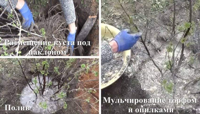 При этом посадочный материал располагают в наклонном положении.Благодаря такому способу посадки быстрее формируется раскидистый куст с широким основанием. Также наклонное положение саженца способствует образованию дополнительных корней и побегов.